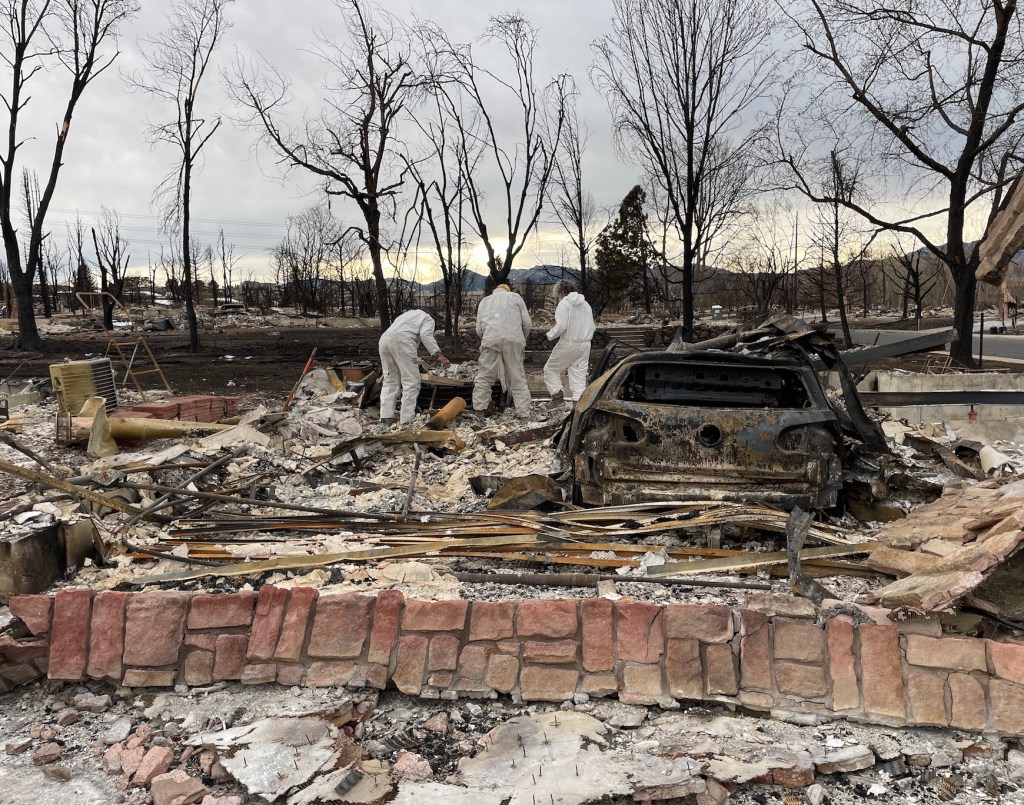 The crew called us around 2:15 on Tuesday and Kate met them at the house around 2:30. They sifted through a ~8’x8′ area where the bathroom fell. They were moving fast because they heard that the city is going to start spraying lots with a substance that keeps the ash down now that a lot of snow/ice has melted.